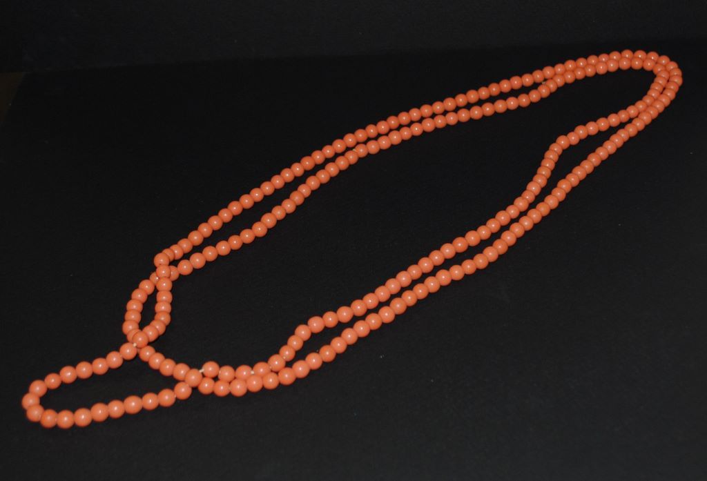 Lady's Coral Necklace. Necklace consists of 6.50 millimeter beads and is 58" in length. Coral beads are medium orangish-pink in color