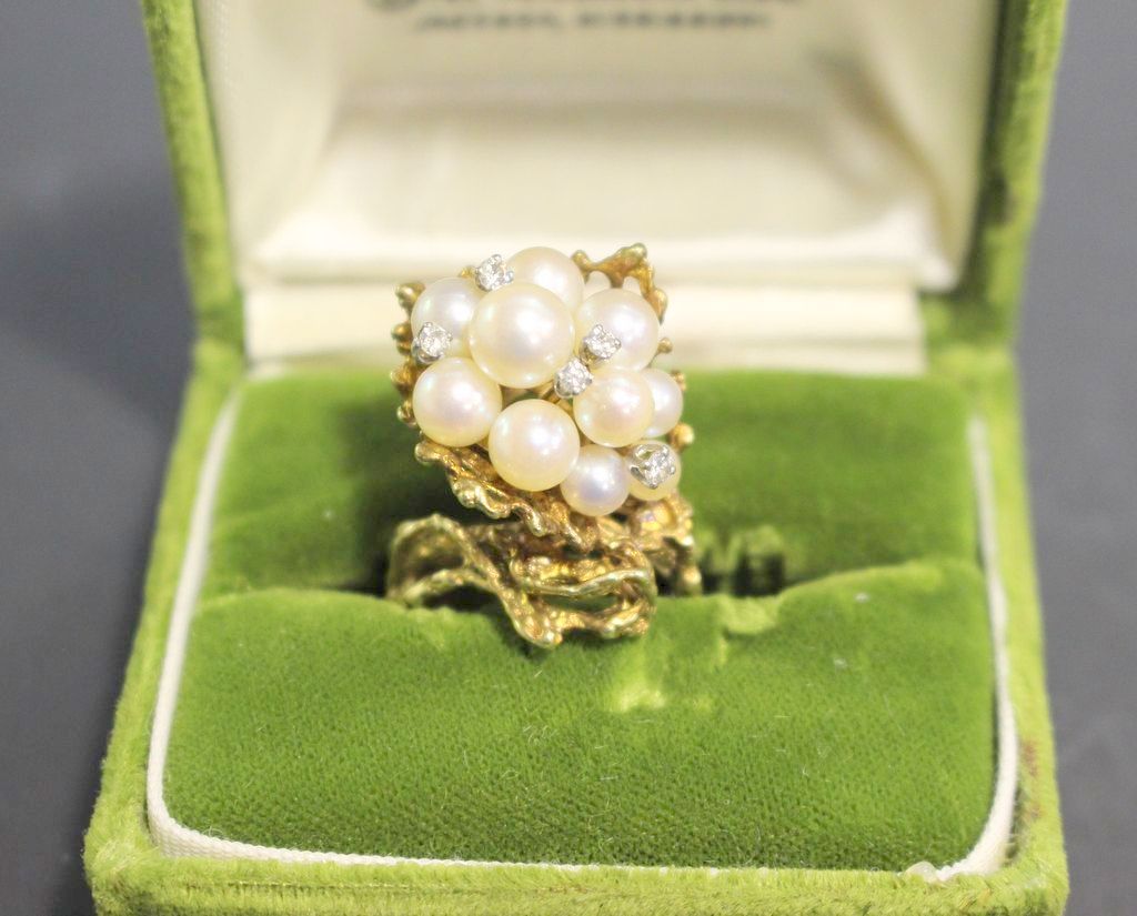 A ladies ring with 10 cultured pearls and five diamonds set in a 14 karat mount. Ring is size 11
