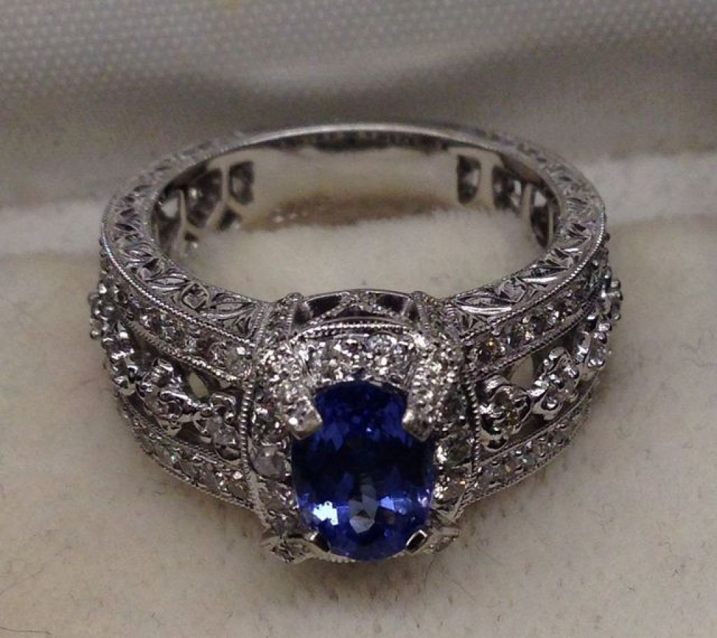 One stamped 18KT white gold lady's cast sapphire and diamond ring with a flat tapered shank with a bright polish with engraving finish. Containing: One prong set oval standard brilliant cut natural blue sapphire, measuring 7.95 x 5.38 x 3.65mm, 12% bulge factor, approximate weight of 1.45ct., clarity is eye clean, type II, medium, moderately strong, violetish blue color, (GIA vB 5/4), cut is fair. The stone tested 1.77/1.78 for refractive index. Stone tested as double refractive. Heat treatment is a common and accepted practice for the enhancement of sapphire. Stone is appraised and valued as heat treated. Ten bead set round brilliant cut diamonds, measuring 1.71-1.70x 1.03mm (depth est.) approximate total weight of 10 Stones= 0.18ct. Clarity- VS-1 to SI-1; Color- H-J; Cut- Good. Twenty-six bead set round brilliant cut diamonds, measuring 1.42-1.20 x 0.79mm (depth est.) approximate total weight of 26 Stones= 0.21ct. Clarity; VS-1 to SI-1; Color- H-J; Cut- Good. Twenty-four bead set round brilliant cut <br />