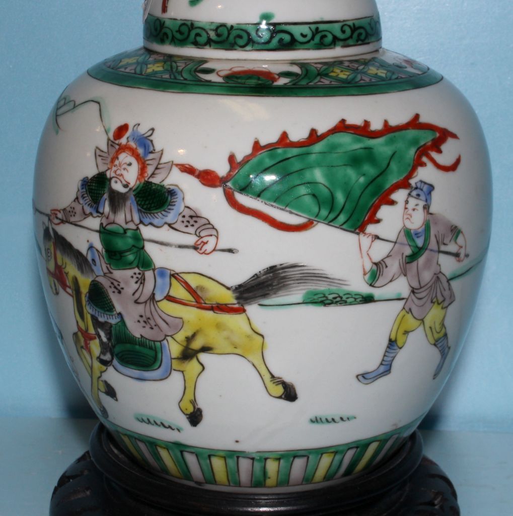 Chinese porcelain ginger jar hand painted with warriors, made into lamp on wood carved base; 22" h.
