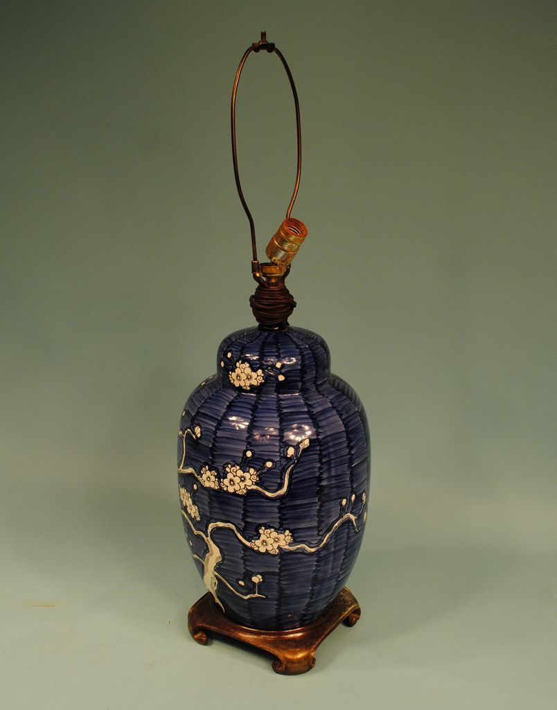 Oriental Design blue and white jar made into lamp on wood base, Jar 14 1/2"h