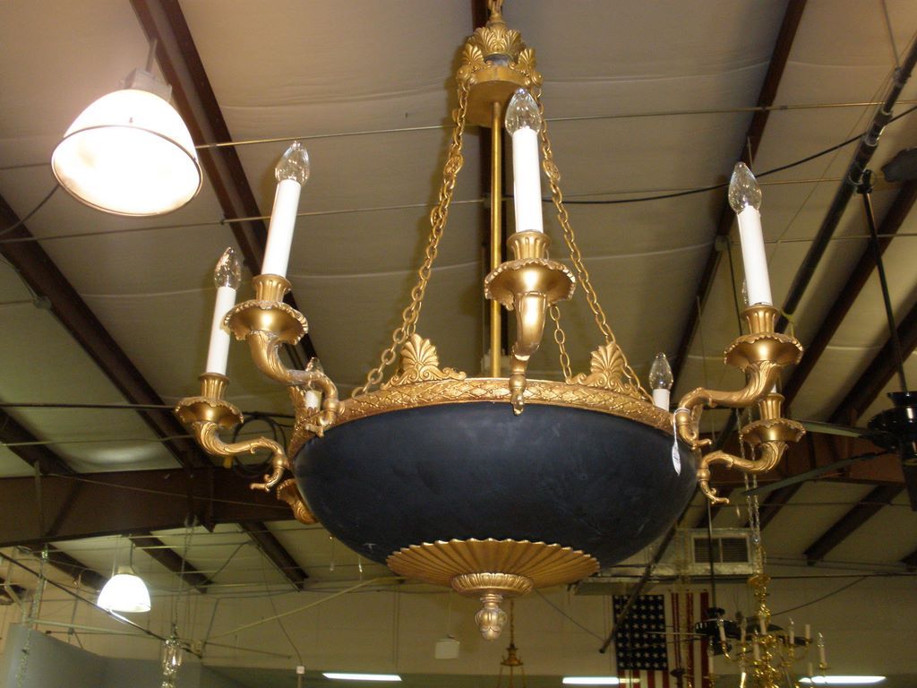 Matched Pair of Empire Style Chandeliers (Selling Choice). Center metal bowl is ebonized w/acorn finial. Bowl surrounded by decorative brass w/eight (1 damaged) acanthus leaves and eight electrified candle arms. Four brass chairs leading to decorative canopy. 44"h x 41"dia.