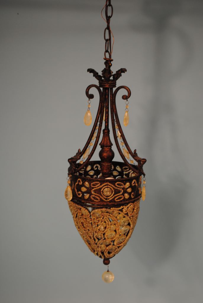 Contemporary (Tracy Porter) Metal Chandelier. Decorative glass design on center section of metal, glass swags. H. 29"