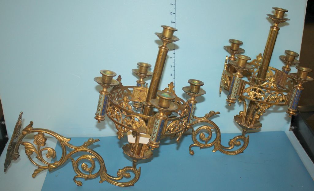 Pair of Heavy Brass Five Candle Wall Sconces; open flower carved with blue and gold accents, 18" h., 8 1/2" w., 16" d.