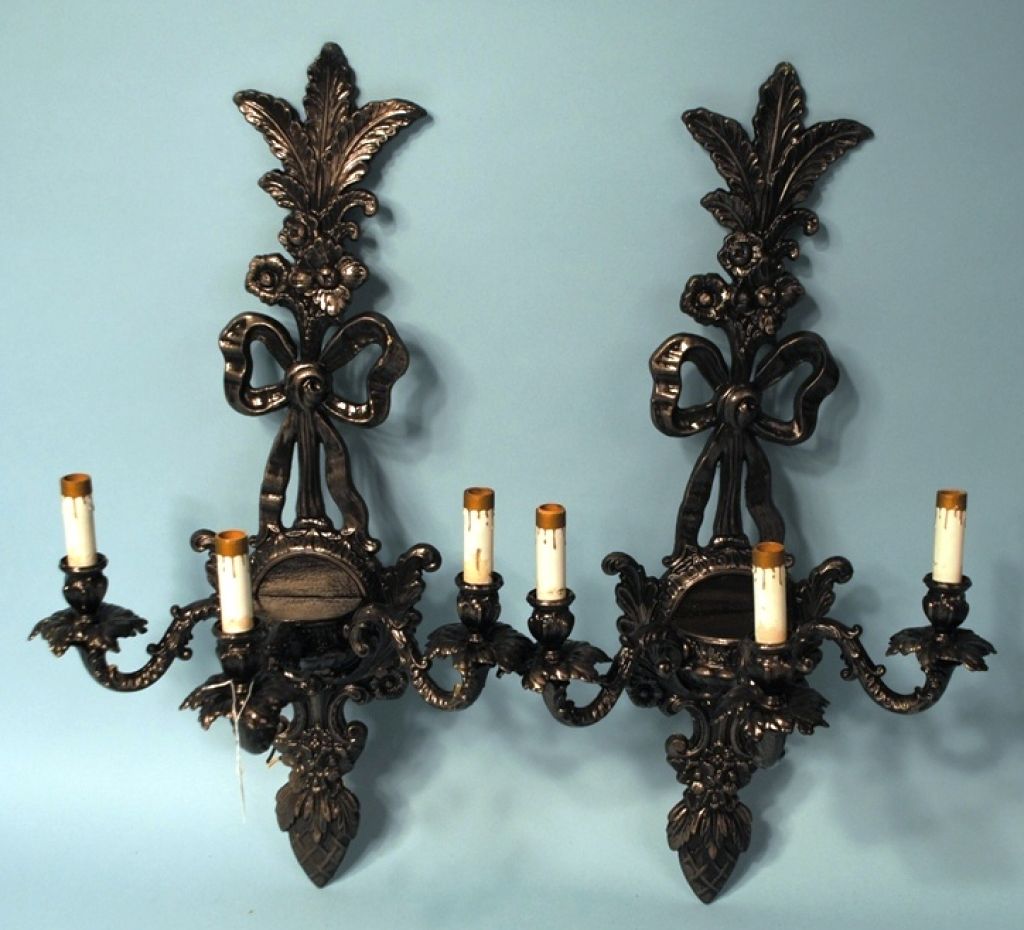 Pair of black & silver rubbed lacquer Finish wall sconces with ribbons & pineapples