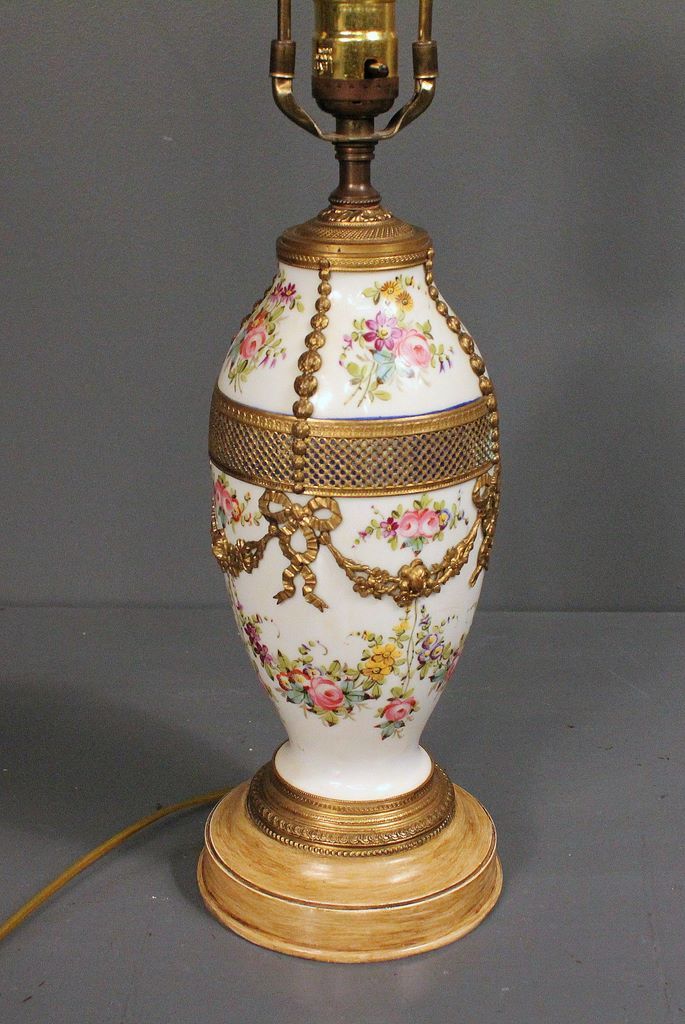 Hand-Painted Porcelain Lamp; decorative hand-painted porcelain with flowers, brass applied swags and bows. 25" h., 5 1/4" dia.