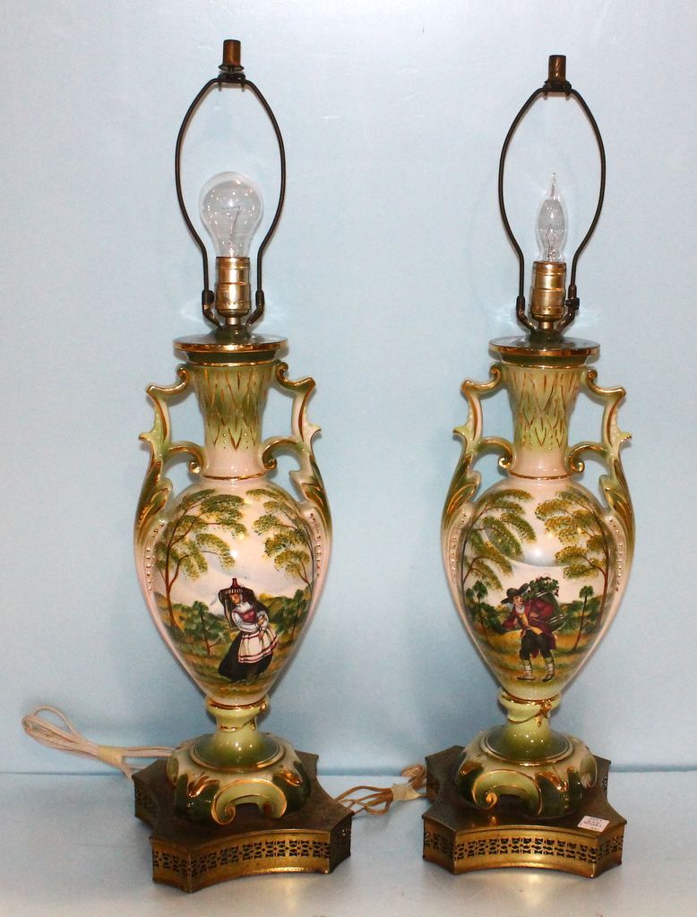 Pair of handpainted porcelain urn shape lamps on brass base; 31''h.