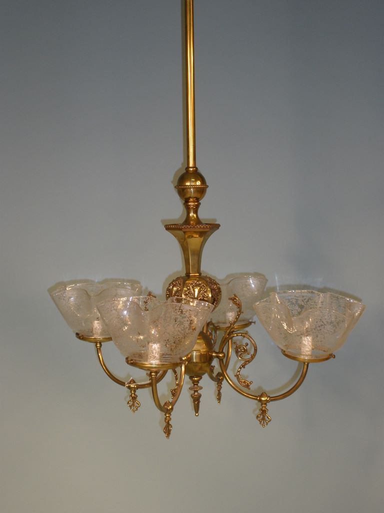 Period Victorian Chandelier w/4 arms, brass w/the original etched glass shades - originally gas, 56 1/2"h x 23" dia.