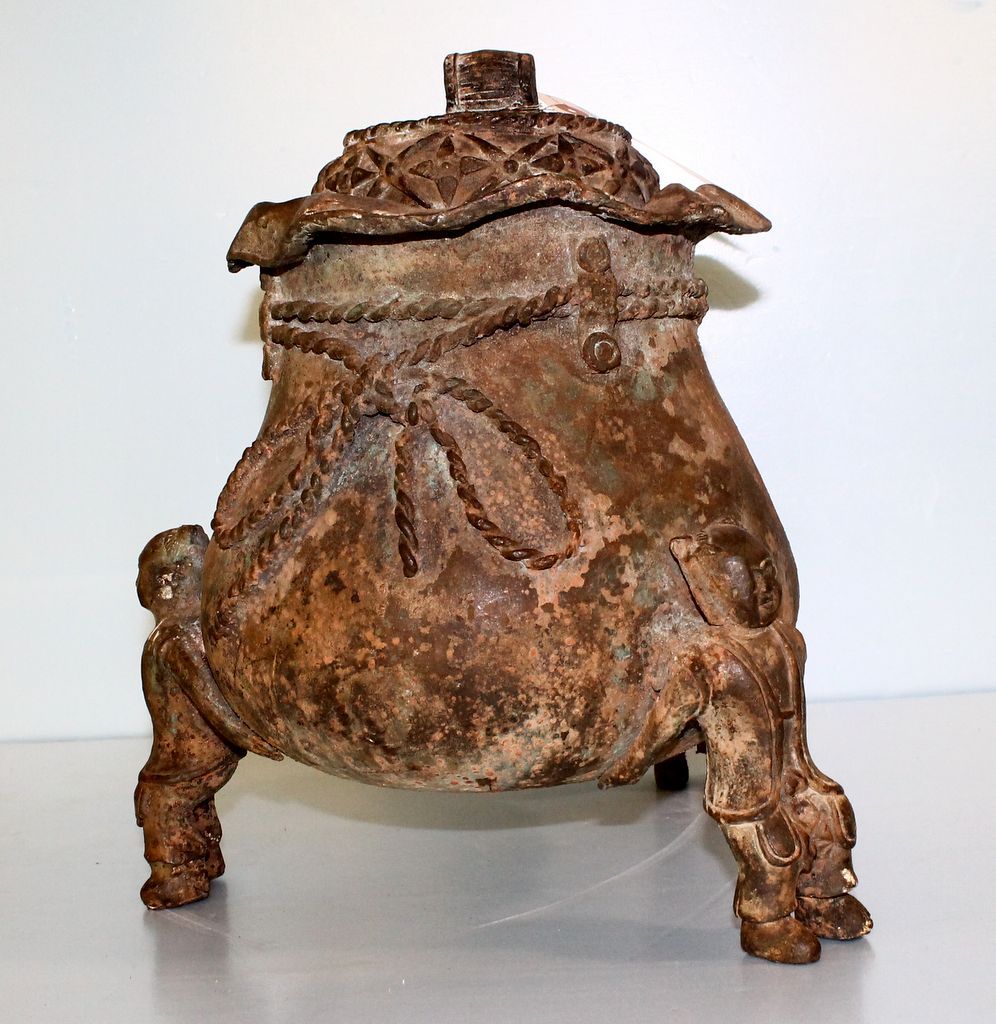 Rare Chinese lidded metal pot with tripod Chinese featured feet; 11" dia., 14" h.