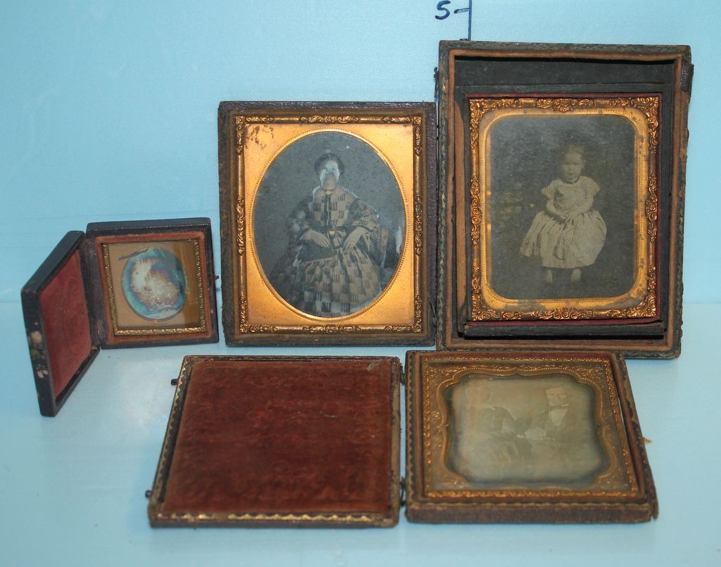 Four "As Is" Tin Types; one small one, not clear but in original case (1 1/2" w., 2" h.), one of lady and gent, not clear but in original case, one of a young lady in chair holding a book, cover to case missing 3 1/4" w., 3 1/2" h., one of a young child, cover missing 3 1/4" w., 3 7/8" h., and a half of old tin type case 3 7/8" w., 4 7/8" h.