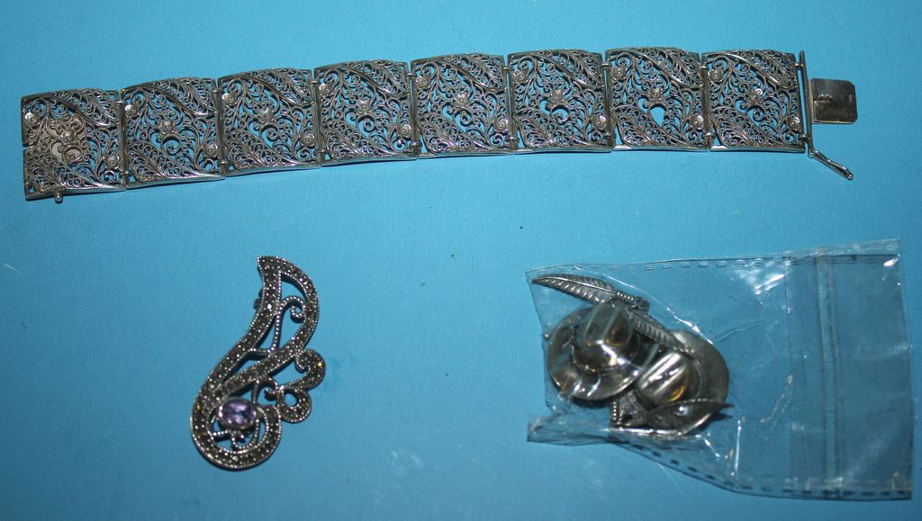 .925 Filigree Bracelet, .925 Cowboy Hat Earrings, and a Marquisate Pin with Purple Glass Centerpiece