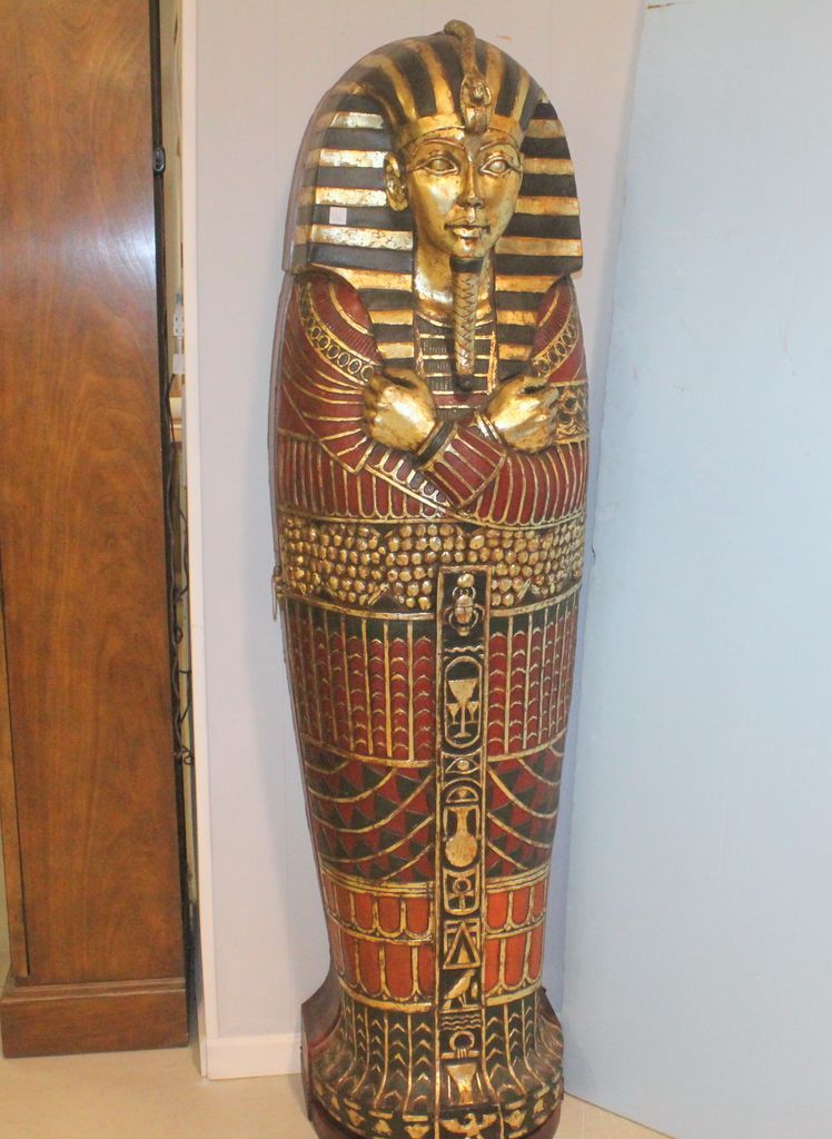 Unusual Wood Carved and Painted Bookcase in the Figure of King Tut, inside has shelves for books or smalls; 20" w., 17" d., 75" h.