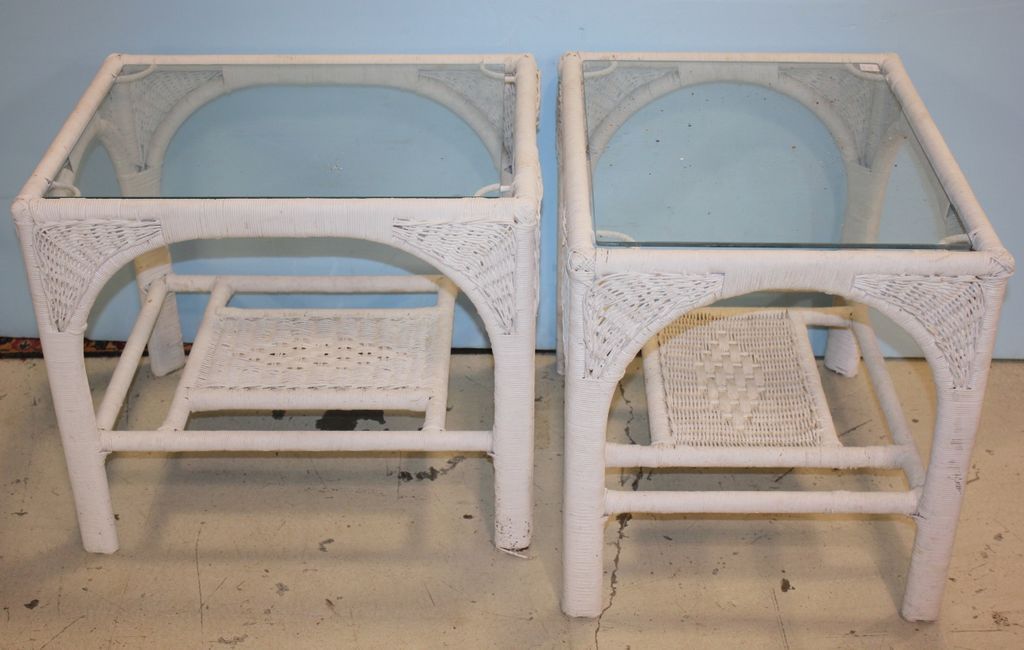 Pair of Wicker Glass Top End Tables; 24 1/2" square, 21" h.