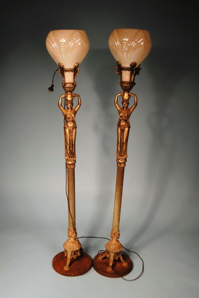 Pair of vintage torchieres. Metal lamps with figures of ladies holding up great deco shades 60"h.