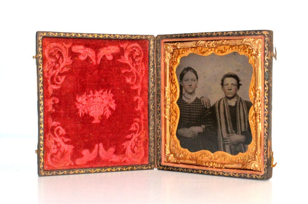 19th Century tin type of young girl and boy wearing scarf. Framed in ornate brass mat in embossed leather case ( some wear) double clasp, velvet pad. 3" w., 3 1/2" h.