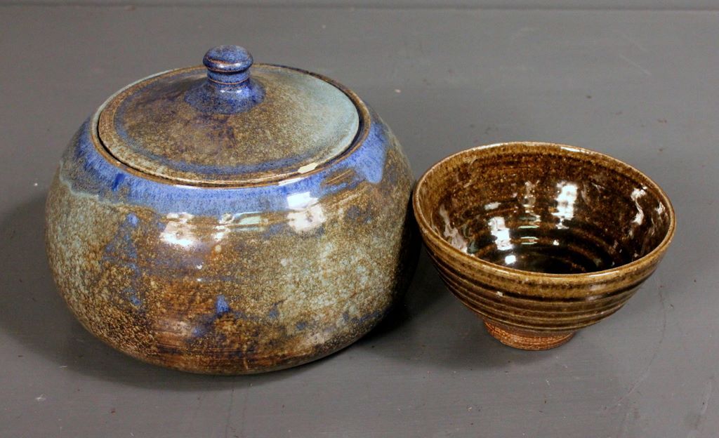 Two Shearwater Pottery Pieces; covered casserole dish in blue and green (chip on rim of lid; 7" dia., 7" h.), brown rice bowl (5" dia., 3" h.)