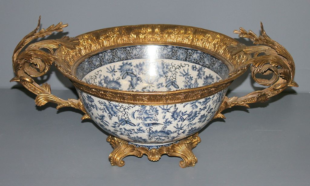 Large blue and white porcelain crackle effect center bowl mounted in bronze. 24 1/2" dia., 9 1/4" h.