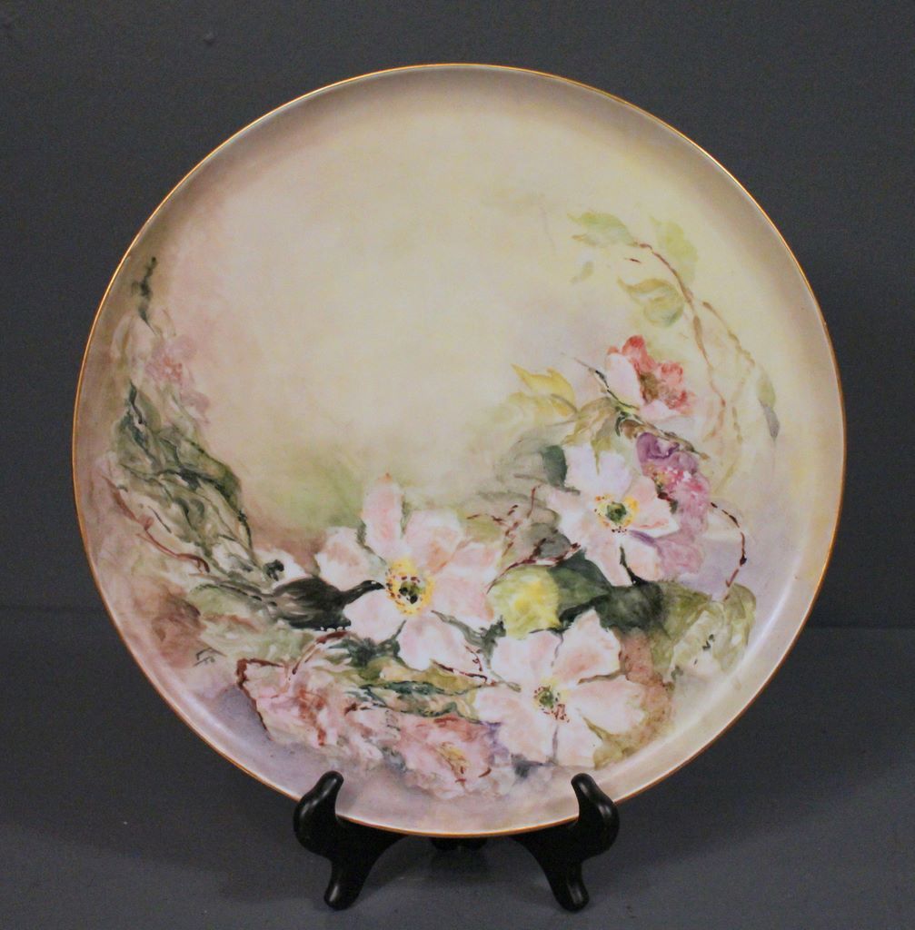 Hand-Painted Bavarian Charger; gold trim, hand-painted flowers on cream ground, two marks, crown above PT, 13 1/2" dia.