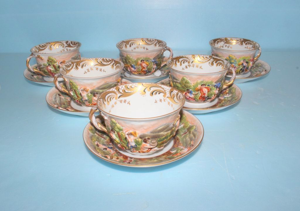 Late nineteenth century set of six hard paste capodimonte five cups and six saucers; 6" w. saucers; 2 1/2" cups