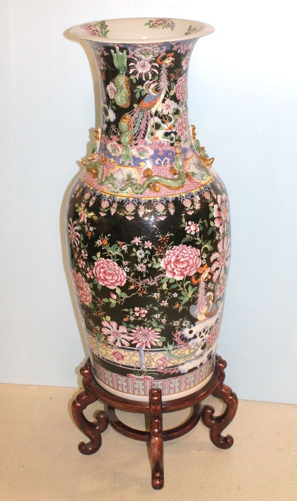 Handpainted porcelain palace vase with scenes of birds and flowers, foo dog handles. Each vase sits on a handcarved oriental style base; vase, 15" dia., 30" h.