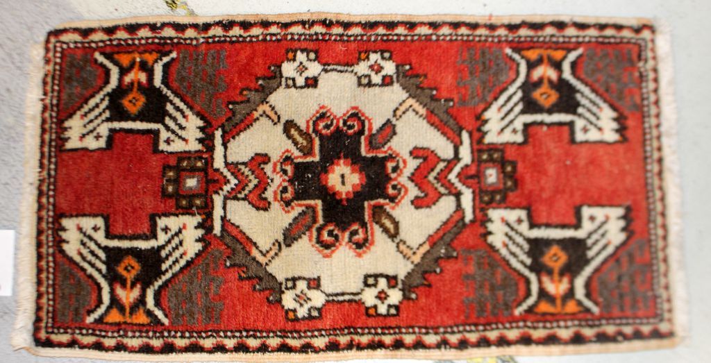 Wool prayer rug having burnt orange field, earth tone designs; 19 1/2" w., 37" long