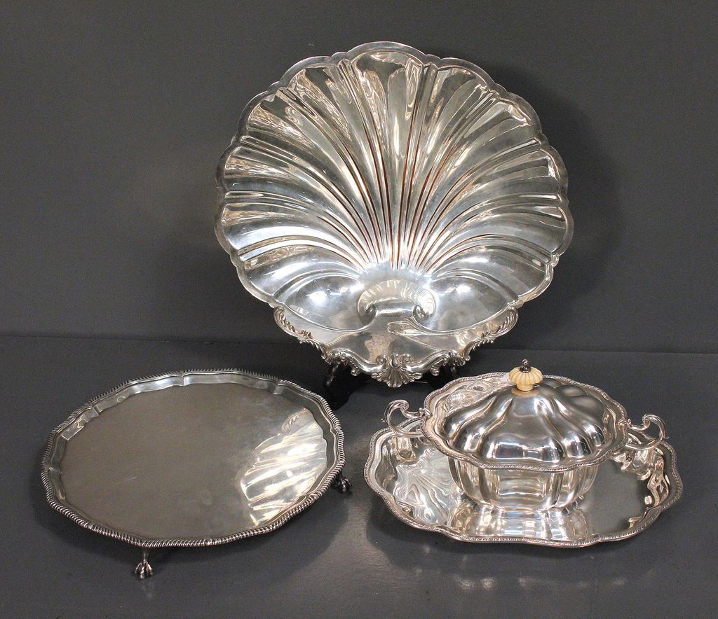 Three Silverplate Pieces; F.B. Rogers Company silver on copper shell shaped bon-bon (12 1/2" dia., 2" h.); covered Silverplate sauce dish with tray, faux ivory tip (tray 9 7/8" w., 6" d.; sauce bowl (' w., 5 1/4" h.); Silverplate footed tray, scallop edge (10" dia.)