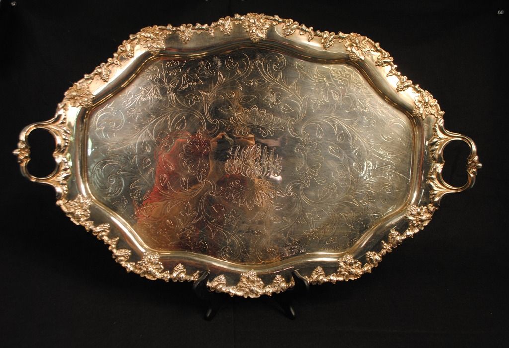 Two handled, footed grapevine design silverplate tray (monogram in center). 32 1/2"