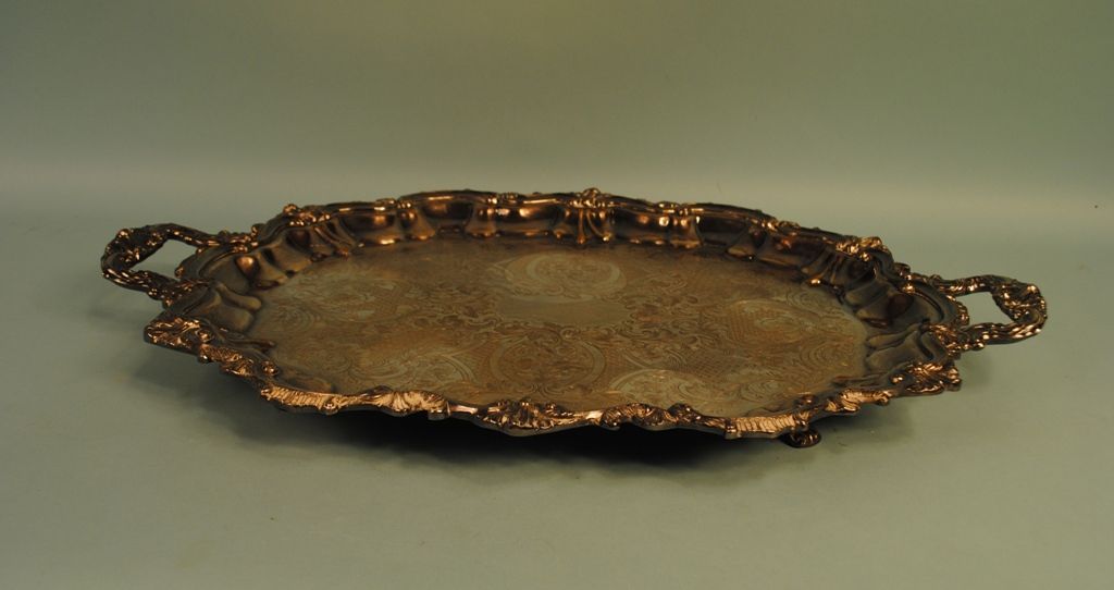 Two handled footed silverplate, tray, center engraving, scalloped edge E.P.C.A. 26 1/2"