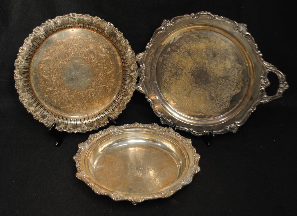 Group of four silverplate trays. Silverplate tray with two handles, fancy vintage grape design and two footed matching round trays.