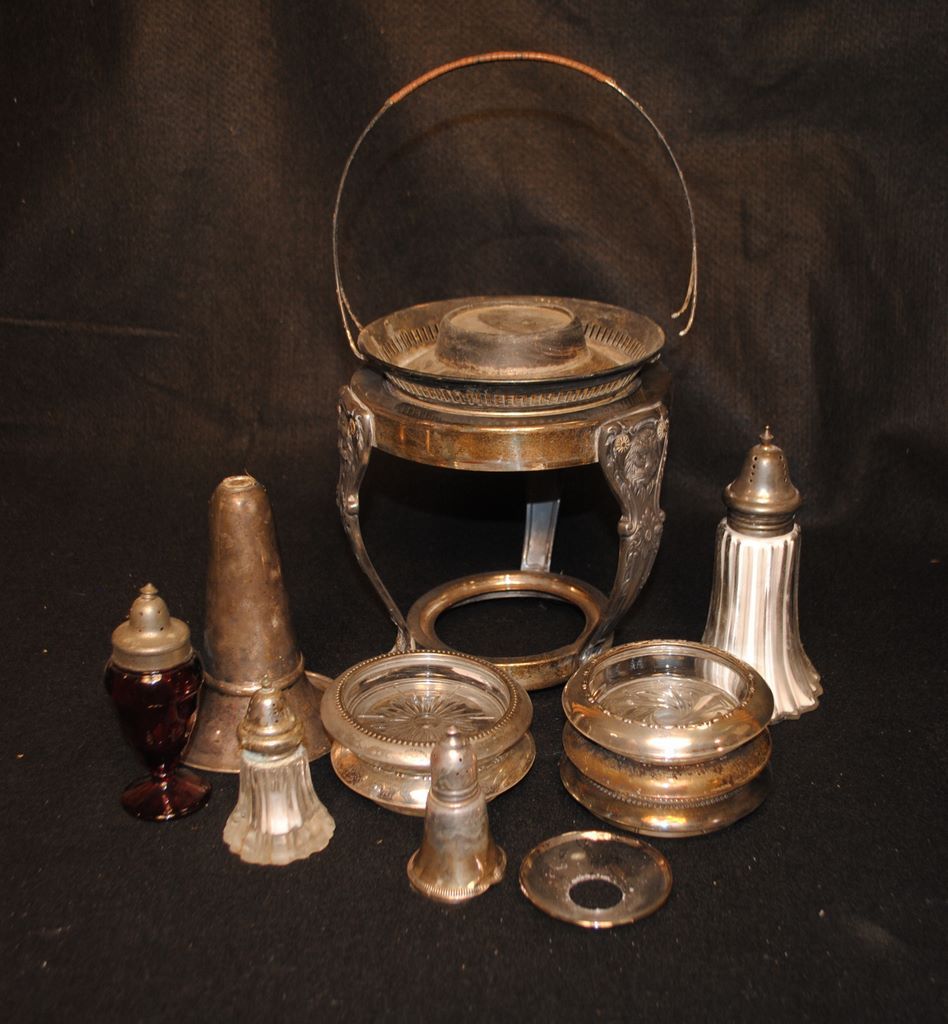 Base to kettle, powder shaker, vintage coasters, shakers, and two vase parts.