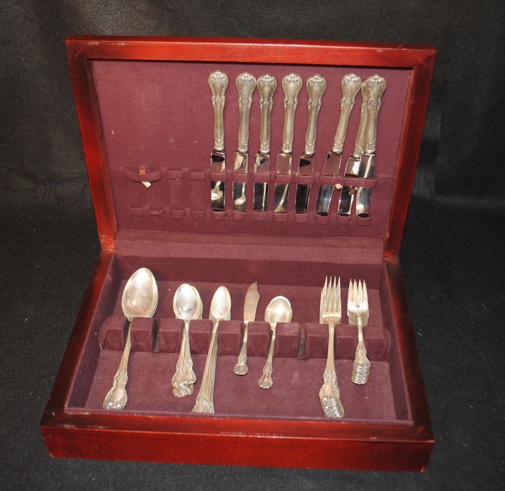 Set of sterling silver flatware "Old Master" by Towle. Set consist of 8 dinner forks, 8 salad forks, 9 teaspoons, 8 ice teaspoons, 3 serving spoons, sugar spoon and butter knife. 38 pcs.