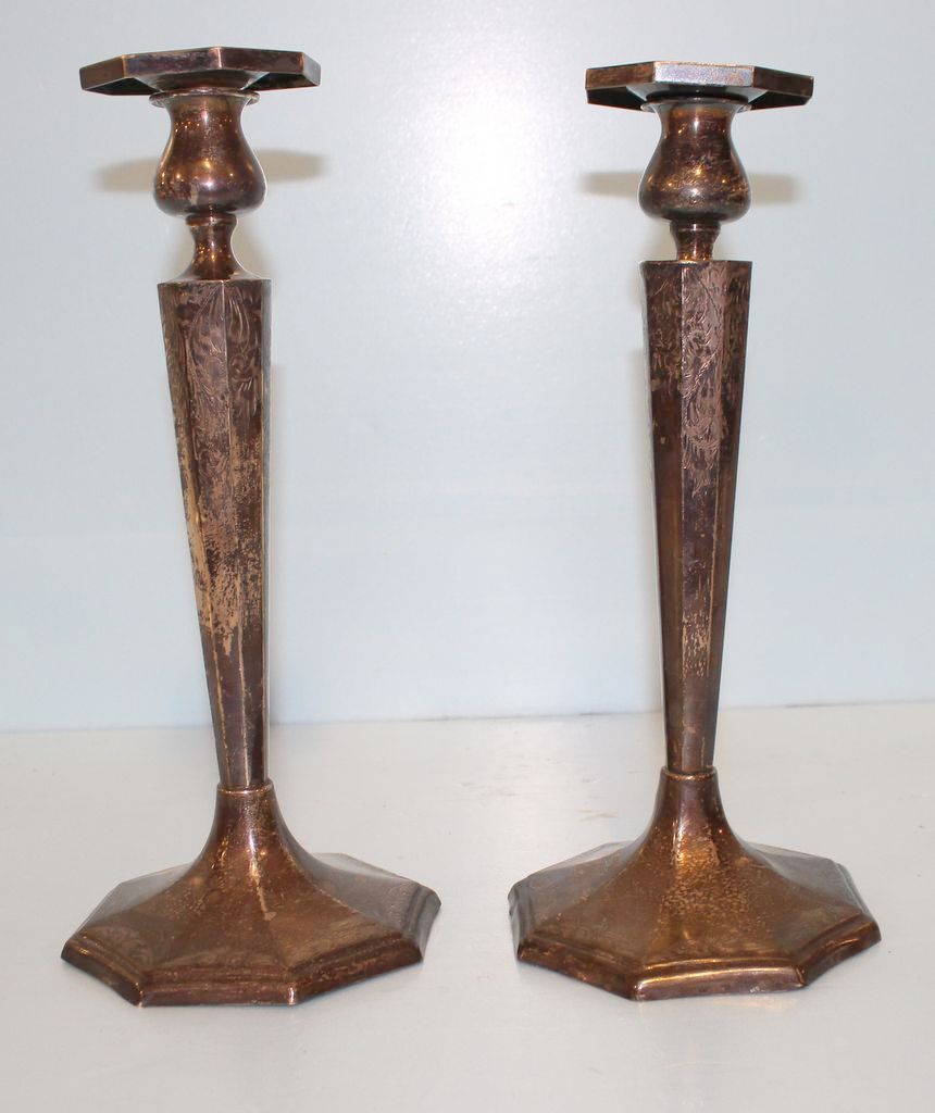 Pair of classical style sterling candlesticks with etching and octagon shaped bases. No makers mark; 12" h. Approx. 11.41 ozt