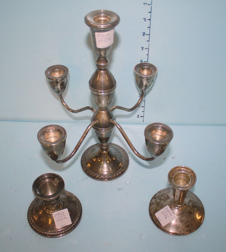 Three Sterling Candlesticks; one Alvin (soldered) 4 1/2" h., one 3 1/2" h., and one four armed and weighted 12" h., 9 1/2" dia.