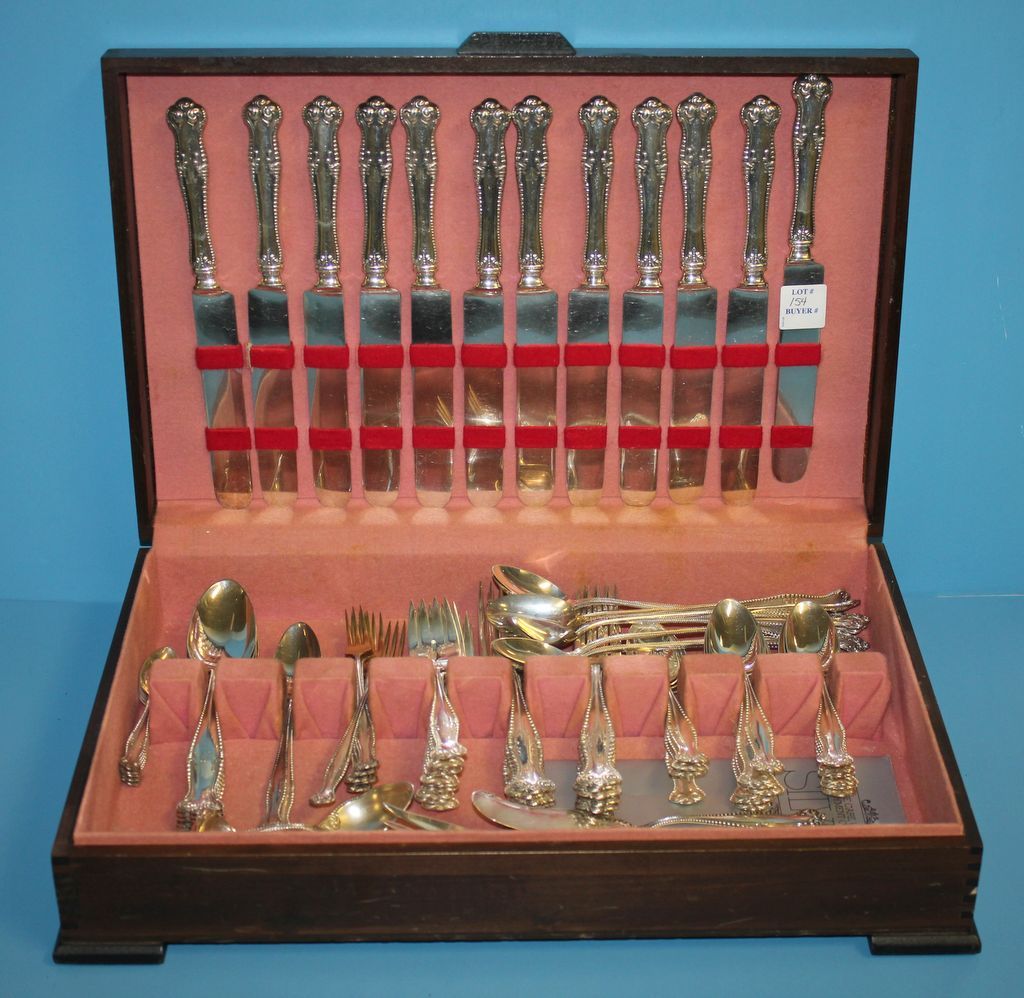 12 Knives, 12 dinner forks, 10 luncheon forks, 6 cocktail forks, 18 teaspoons, 2 ice teaspoon, 6 serving spoons, 5 demi-tesse spoons, butter knife, sugar spoon, meat fork, and small ladle.