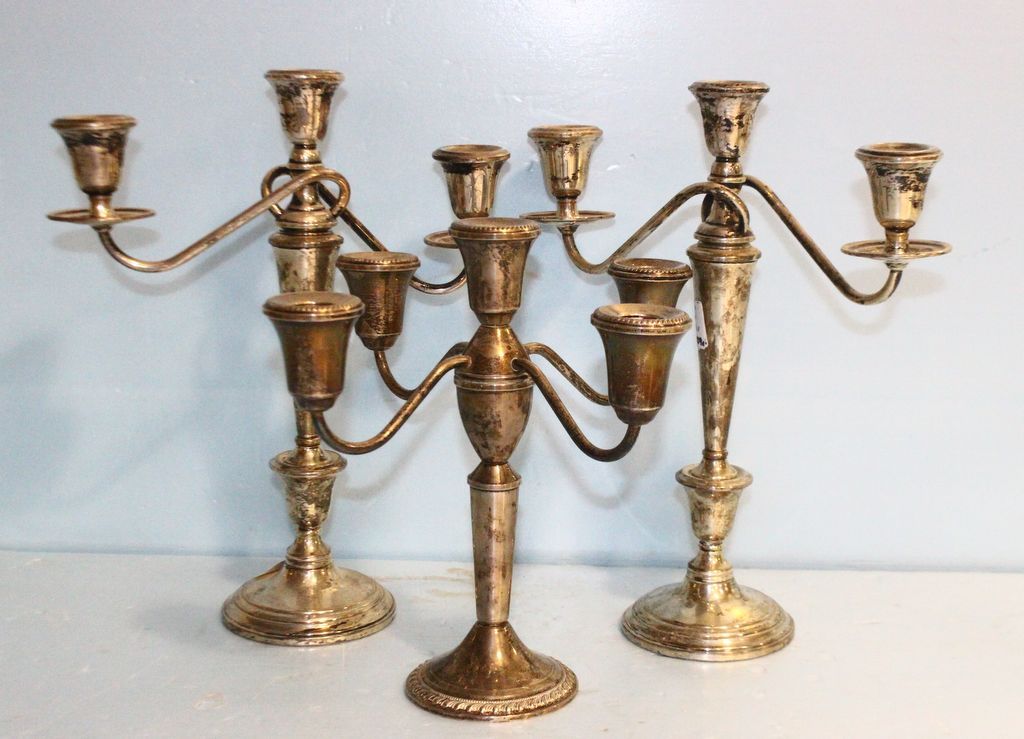One pair Revere sterling candlesticks, wieghted, #1108, 12" h. ; one sterling Mayflower candlestick, weighted, 9 1/2" h.