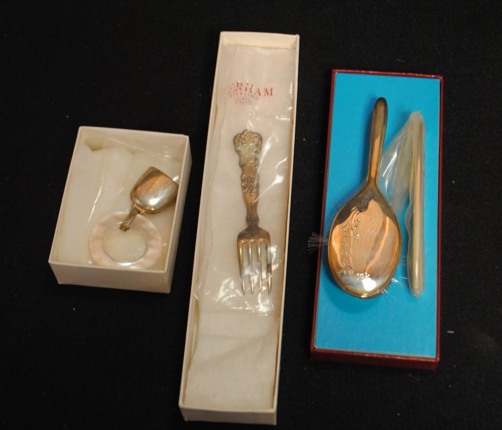 Sterling silver baby items. Sterling baby bell with faux pearl ring from Bourgeois Jewelers, initials JRG, Gorham sterling baby fork-4", sterling silver Gorham baby brush and comb.