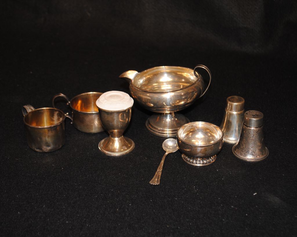 Lot of sterling includes two sterling baby cups. H. 1 1/2", two sterling silver envelope sealers (one in box) H. 2 1/2", sterling stamper H. 2 1/2", sterling master salt with spoon Dia. 2 1/2" and sterling creamer, H. 3"